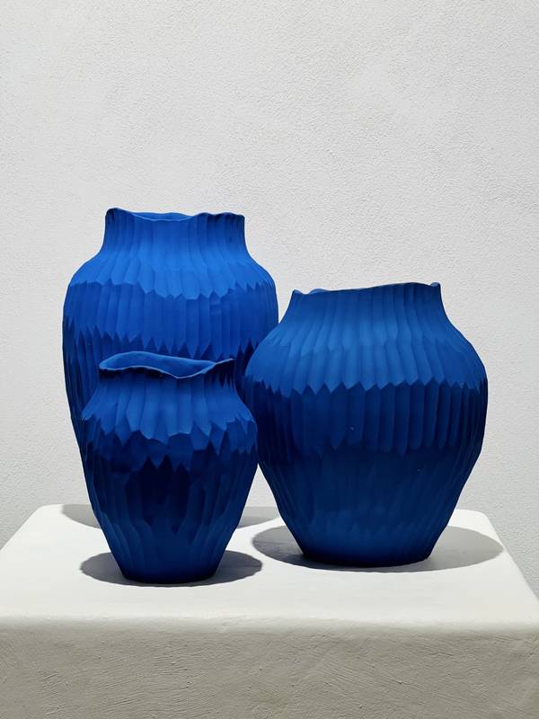 Beyond the sea of blues at her doorstop, Bianca is also fascinated by cobalt’s chemical qualities. “It’s a challenging colour to achieve when it comes to ceramics that go up to 1300 degrees Celsius,” she explains, “but it’s all worth it as it gets me excited every time I open my kiln and see new unique cobalt blue artworks inside”. Reflecting on her Artist in Residence display, Bianca says: “This work represents my true self at this moment in my life. The use of colour comes from having my first child and being connected with this place of unconditional love and freedom. My intense nature is what you can see when looking at bold colours”. Similarly, the complex textures map out the unfolding of her life. “The unique characteristics in each piece are representations of the time it was created, as if it was a photograph that you can look back at and feel nostalgic about.”