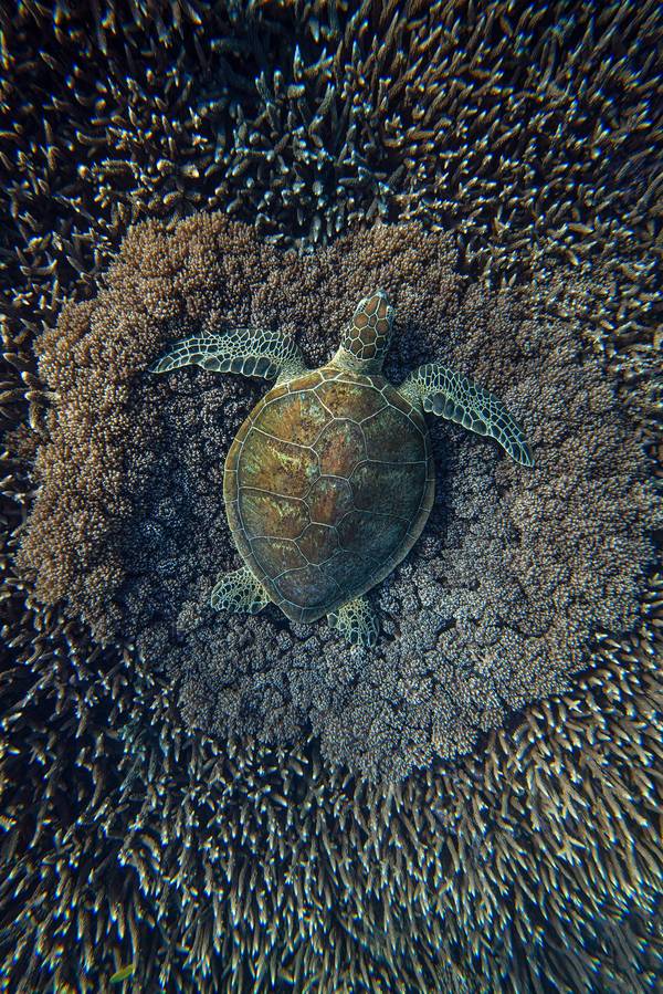 I was swimming through a turtle cleaning station where various species of sea turtles go to get their shells and skin cleaned by fish, such as the cleaner wrasse. There was a line of turtles waiting, like a line in a supermarket, and once the green turtle in front had had her turn she swam off and nestled in, got comfortable and had a rest amongst the soft coral polyps. It was a beautiful moment to witness and she was completely comfortable with me being there.