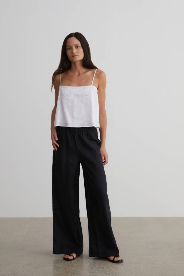 Model wears the Neva Top in White and the Nilsa Pant in Black