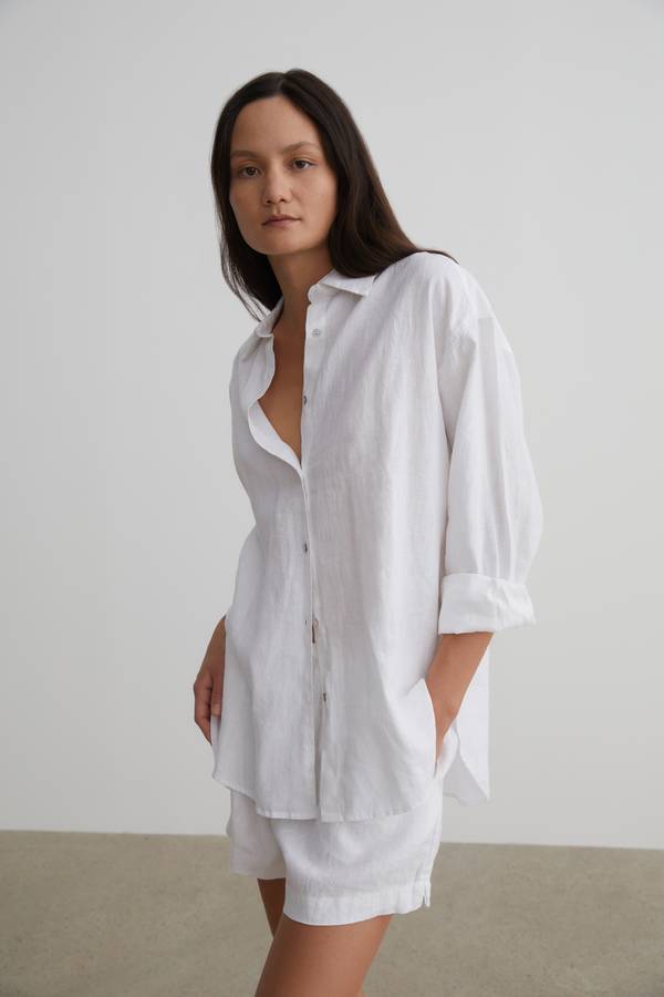 Model wears Oversized Linen Shirt in White and Stella Short in White
