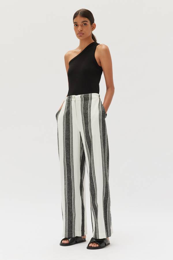 “It’s the perfect pant for afternoon drinks as the weather gets warmer! The texture in the pant elevates it from being a simple stripe, the monochrome colourway is easy to style and the stripe makes my legs looks twice as long!”