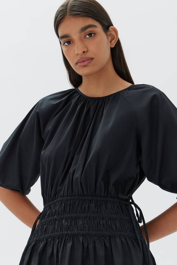 “The Fleur Poplin dress evokes a perfect mix of minimal and classic. The cotton poplin fabric is easy to wear, lightweight and very comfortable. The gathered waistband tie details are a creative design feature that is not only flattering but also provides a nice shape and silhouette on the body. Plus, I love a puff sleeve!”