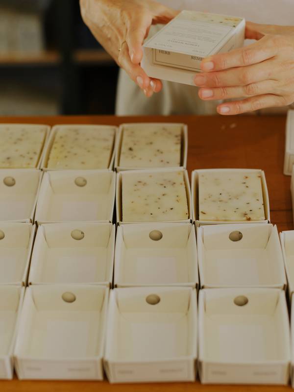 Despite growing its offering over the past year, at its core, the brand remains focused on its array of handmade botanical soap bars. Unlike commercial soaps, each soap bar is crafted using a traditional cold-press method and traceable ingredients that serve a specific purpose. “Every soap bar starts with a base of Australian extra virgin olive oil and coconut oil, then we layer in herbal infused oils, dried plants, clays, charcoal and essential oils depending on what the bar is designed for,” says Amanda.