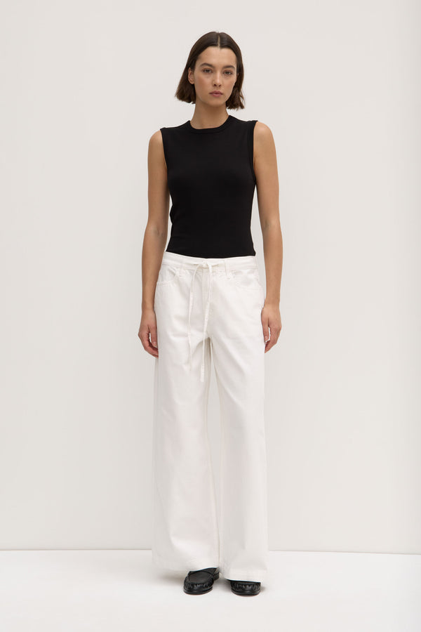 Designed to sit mid-rise, they offer a relaxed fit on the leg and feature an adjustable waist tie.