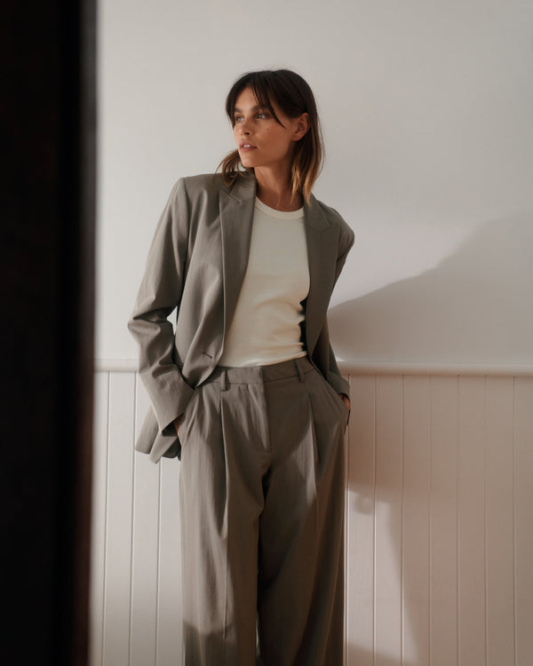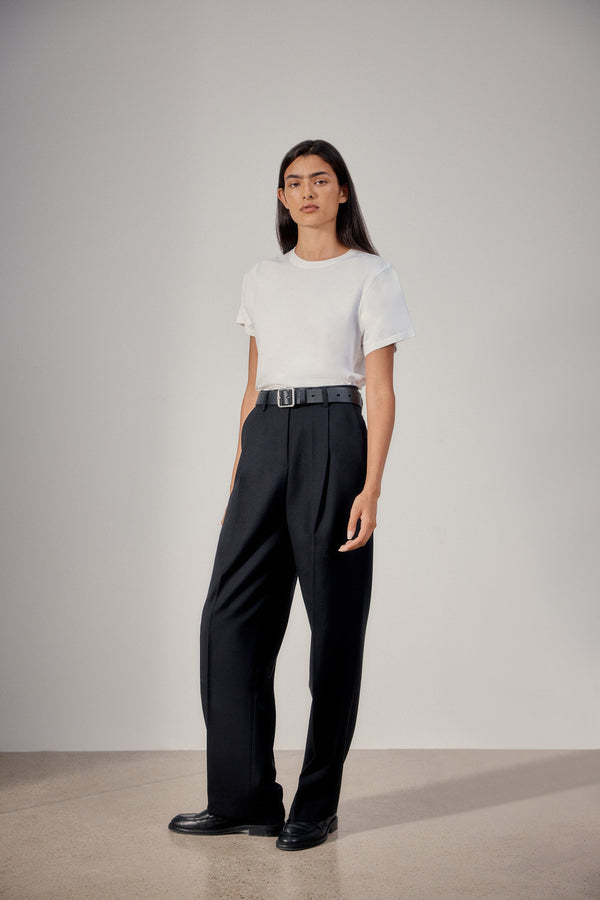 A tailored pant featuring a single pleat at the waist, pockets, fixed waist and wide leg that moves effortlessly.