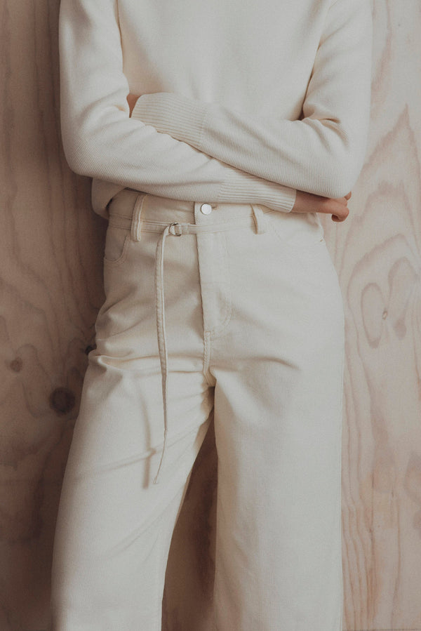 An elevated pant style in cotton corduroy that features a high waist cut, wide leg and removable cord belt.